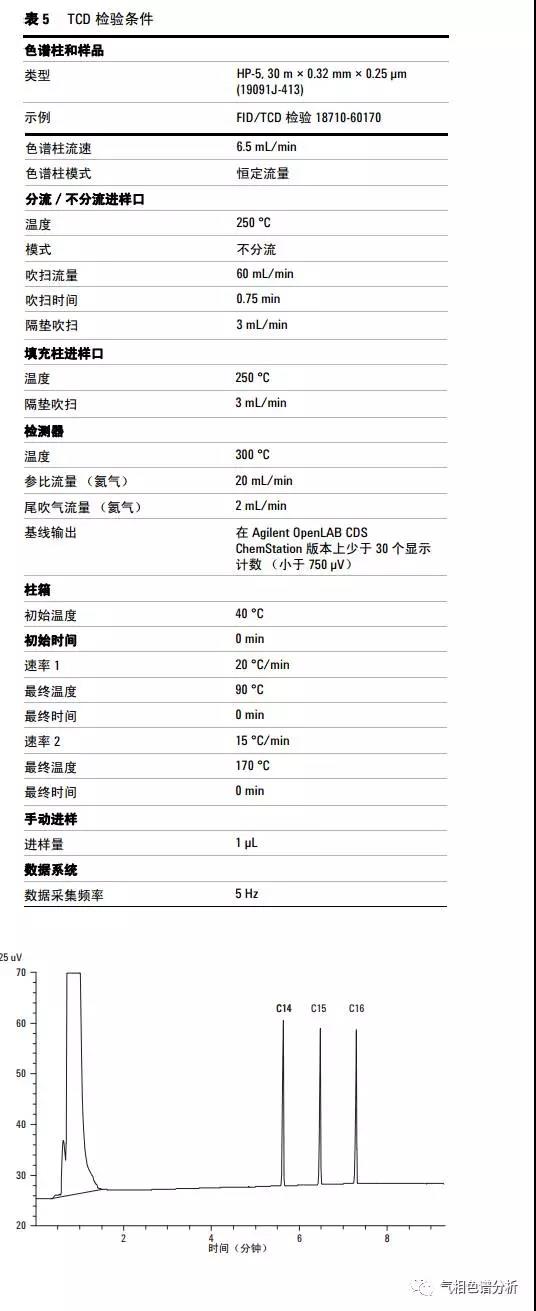 具體的儀器實(shí)驗(yàn)條件,包括進(jìn)樣口的溫度、柱箱溫度和檢測(cè)器溫度,載氣流速以及橋溫/橋電流的設(shè)置,應(yīng)當(dāng)根據(jù)廠家推薦的值進(jìn)行設(shè)定。